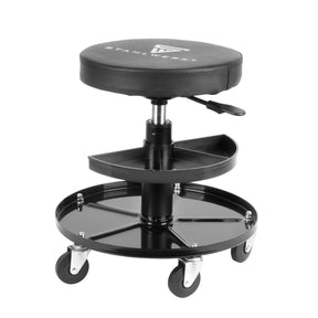 Flexibler Werkstatthocker mit praktischem Ablagefach für Werkzeuge.
